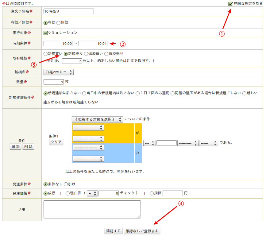 ①時刻条件を表示させるために詳細な設定画面というチェックボックスをクリック