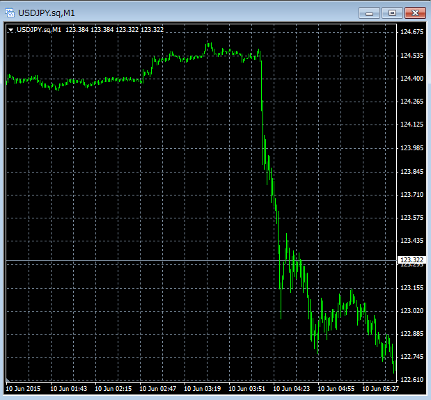 国会での黒田発言が報道された直後には124円60銭から123円前後まで、ほぼ瞬間的に上昇。1分足を見ても、ほぼ直線的変化だ。