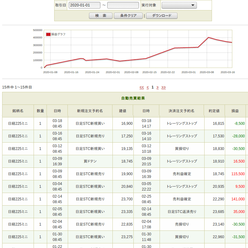 かたや安定版はトータル利益としては負けてはいるもののミニ一枚の取引でこれだけ利益を獲得できれば充分すぎるほどです。